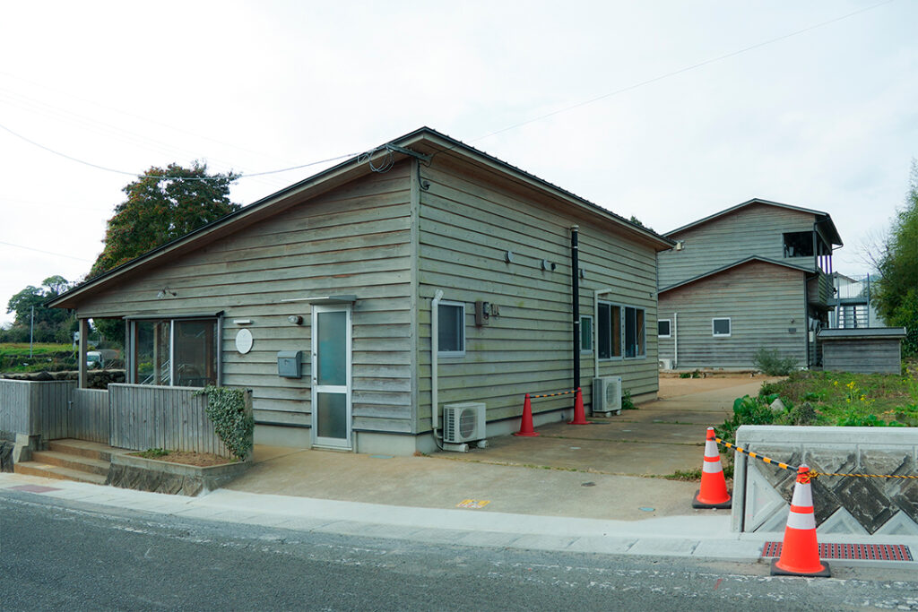 「おうとうのいえ(手前)」と「本山ヒルズ(奥の二階建ての建物)」。子供達が利用する学童保育施設と移住者向けの小規模集合住宅を併設した場づくりが評価され2020年にグッドデザイン賞を受賞している。