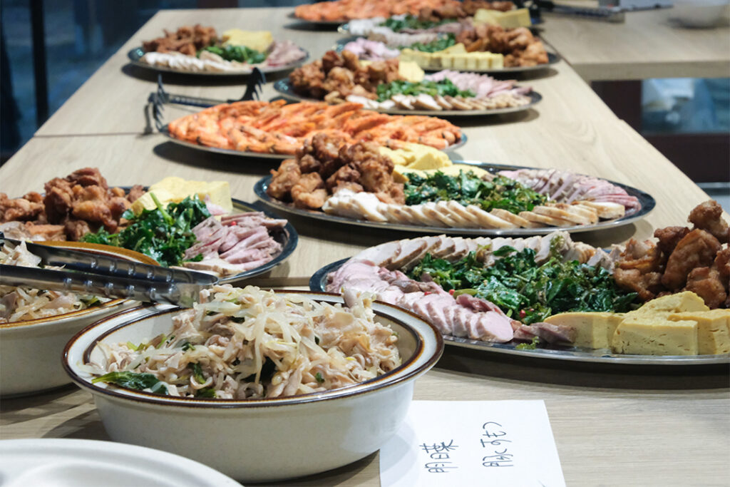 ケータリングは元町の「喫茶酒場なべきち」より。島の食材「はんばのり」を使用したおにぎりや、明日葉を使ったもつ煮など、島の食材を生かした料理が並びます。