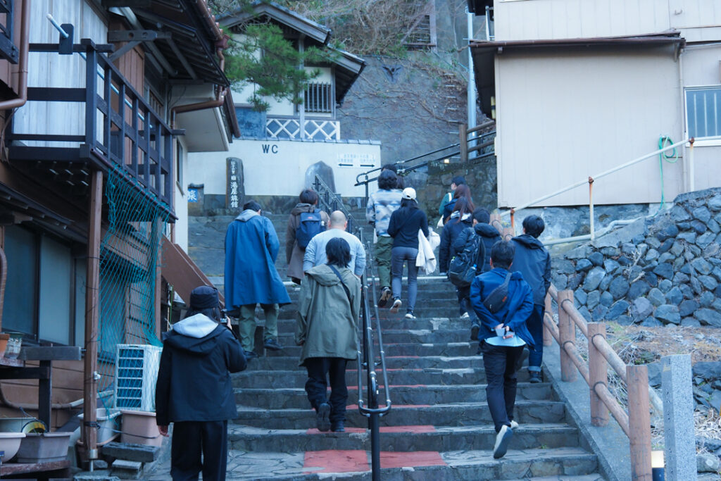 最初に現れたのは「踊り子坂」と呼ばれる石段。ガイドを聞きながら約240段の階段を一段ずつ登っていきます。