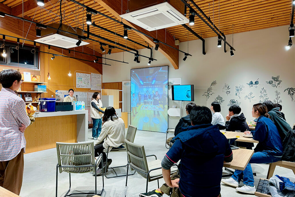 当日は、大島側から予定していた地域おこし協力隊の登壇が体調不良で叶わなかった一方で、大画面空間共有システム「tonari」を通じて東京・大手町とつながり、武蔵野美術大学の学生によるマップ型エッセイ「伊豆大島、情緒の旅」の完成報告も行われました。